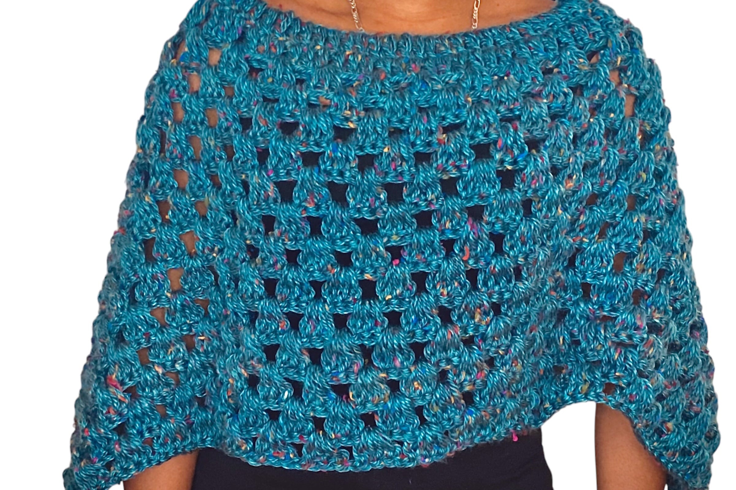 Crochet Poncho Wrap, Turquoise Blue with Flecks, Open Weave Pattern